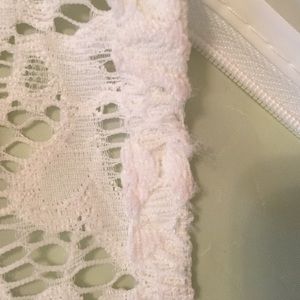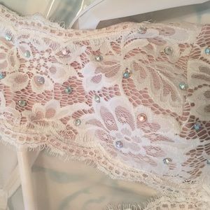White lace dress with nude underlay and small gems on the front top of the dress. Hemmed for a 5"2 1/2' height with 2 inch heels. Can fit size 0-2. The front top has a mesh covering over the chest (fits size 32C). Only worn to two proms. Great condition but has one tiny tiny yellow spot on front of dress that was there when I bought it, you really can't notice it unless you study the dress closely (otherwise I wouldn't have bought it). Feel free to ask for more pics!