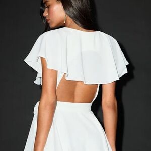 A chic white romper with a flattering V-neck and soft ruffle sleeves. Wrap-style waist creates a defined silhouette. Lightweight, layered skirt offers graceful movement. Perfect for events and evening outings in white. Never worn!