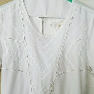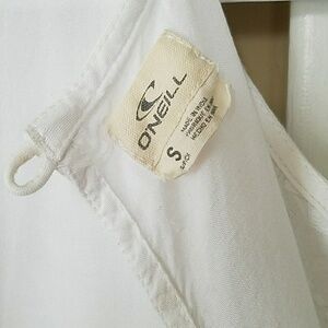 Thin white short sleeve romper. Worn once on a trip on the ocean. Bottom is lined. Hook in back. Machine wash. Rayon with cotton trim on frint. String to tie in back.