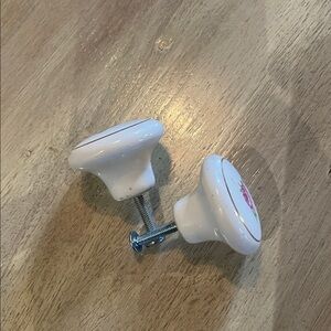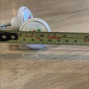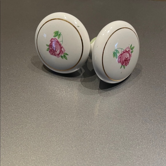 2 White cabinet knobs with a painted rose detail. Excellent condition