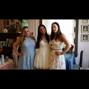 White floral laced ruffles. Low cut back. Worn once for my bridal shower. Does a few small stains. Needs to be dry cleaned. Stains will come out.