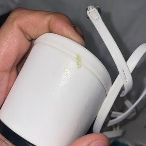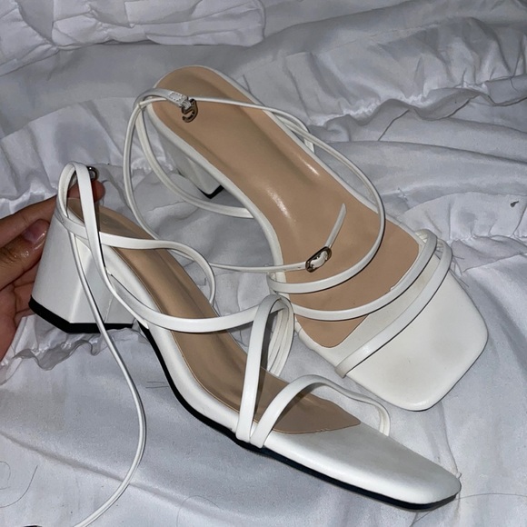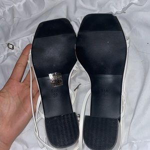 Worn once inside, white block sandal. small green stain on back of heel Once inch block heel