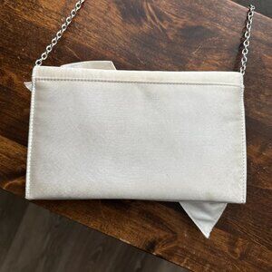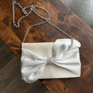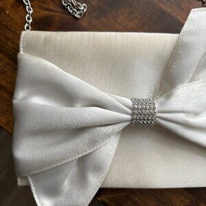 White satin Badgley Mischka blinged bow clutch