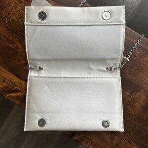 White satin. Chain crossbody strap that can be tucked into the bag if you want to carry it in your hand. Magnetic closure. Badgley Mischka label at the interior.