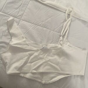 White party set. Cropped top with split hem pants. Detailing on pants and top. Top is adjustable on one strap