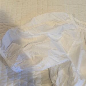 New white shirt with elastic waist, puff sleeve and opening detail in back.