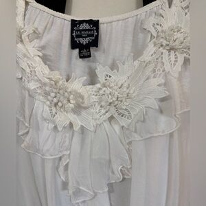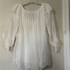 White silk made in Italy blouse. 3D flowers at v neckline. Ruffle front.