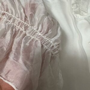 White silk made in Italy blouse. 3D flowers at v neckline. Ruffle front.