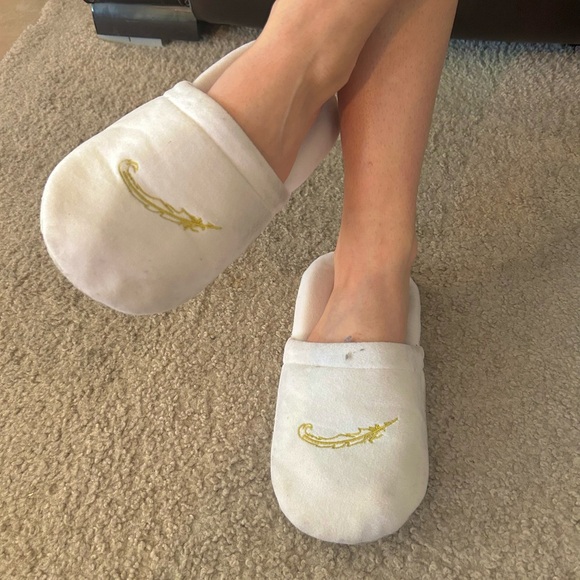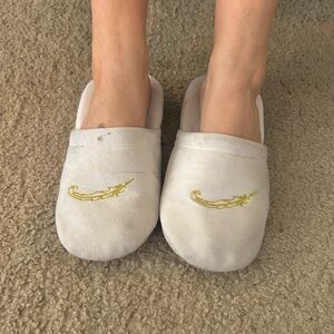 Simple white slippers with soft bottoms. Love to be worn around the house but looking for a refresh. Used/pre-loved condition. Any other questions just ask 😊