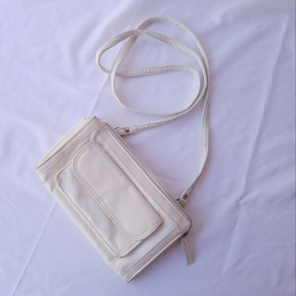 This small white purse has a snap pocket on the front, front interior has a cash slot, with 3 card slots on the side of that. A Middle zip pocket in the middle. There are 3 card slots on the back interior and another cash slot. The shoulder strap is removable,49" long, the shoulder strap is pretty beat up the PU (Polyurathane) is peeling and worn off. Personally I would toss the shoulder strap and use as a clutch. There is a little bit of wear on the base and the two bottom corners of the front pocket have cracked and peeled.
