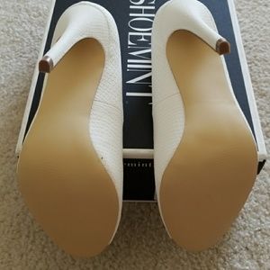 Custom designed, brand new-without tags in original box. Snake print, peep toe shoes, never worn. Please note the very small black dot on right shoe very close to the sole which cannot be seen. Only reasonable offers accepted.