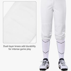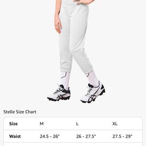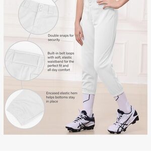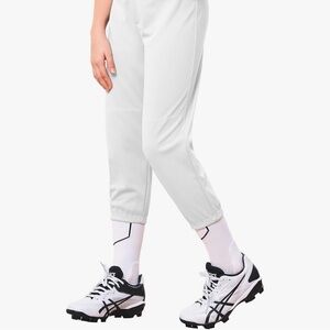 These white softball pants offer a relaxed fit with an elastic waistband for comfort and style.