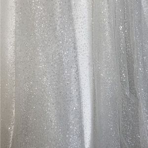 This dress has never been worn. This is a white sparkly dress with a mesh overlay. Very flattering open back with a mid length train.