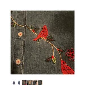 The blue denim provides a classic, versatile look, while the delightful red cardinal design adds a pop of color and seasonal cheer.