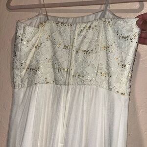 Worn once, like new. This long formal white dress has gold sequence design. size is a 10 but can fit a 12. Has a clear rubber band inside the dress to hold up that does help.