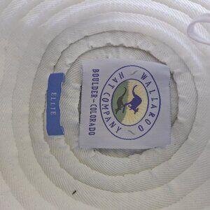 White bucket sunhat with wooden beads around rim. Good condition, slight discoloration on part of the inner band but clean.