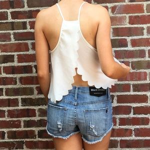White tank with scalloped hem and open back. 100% Polyester