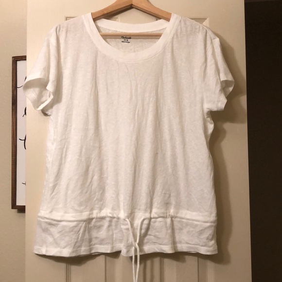 Madewell, super soft only worn a couple times. Never washed either. Cute tie at the bottom for a more feminine fit. Very good quality t shirt