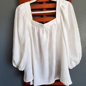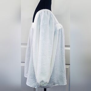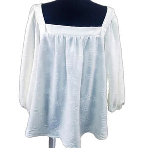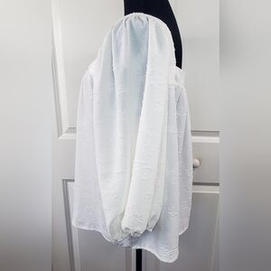 White textured balloon sleeves size L. NWOT. A boutique purchase and never worn. A true, bright, white blouse with square necklines on front and back. Flowy and feminine top that can be worn dressy or casual. Loose fitting and flattering for all body types.