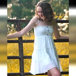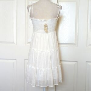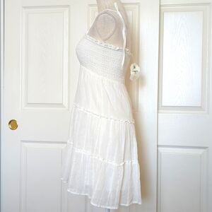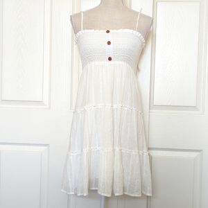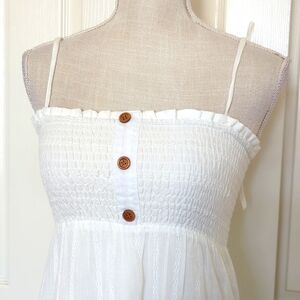 White tiered Linen Mini Dress. Adjustable straps. Faux buttons front detail. Elastic gathered bust. Lined. New with tags.