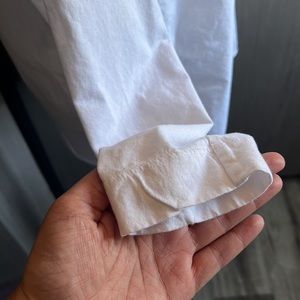 White undershirt the sleeves are a different fabric than the main part of the shirt buttons down halfway and the buttons are still holding on, but the strings look like they’re fraying