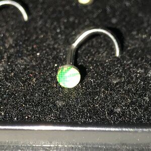 These are 18 gauge C-shaped nose rings. They each have a Design on them that is 3mm round. The nose ring design is White with Green Pot Leaf. This nose rings is 316-L surgical steel.