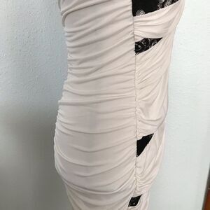 White and black party dress. The prep black lace really sets this dress apart and makes it unique. Worn only twice once for my bachelorette party and another for a black and white party. Very form fitting, mini, strapless, but flatter touched style around the mid action dress. Comes from a smoke free home.