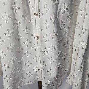 Chic white eyelet blouse with button-up front and built in tank top. Cute ruffled neckline, tie front size L
