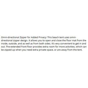 Stability & Windproof: Good rods are the key to keeping a tent stable and windproof, this one has 8mm fiberglass rods. And the beach tent is also equipped with 8 steel stakes, 6 sand stakes and guy lines.