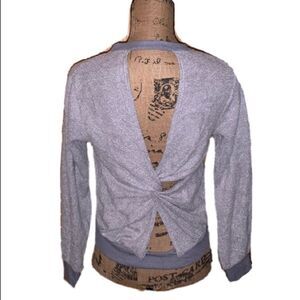 Super cute top. Open back with a kind of twist in the middle. Banded at the wrist and waist. In good condition
