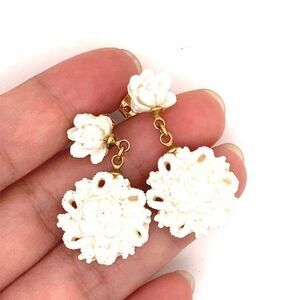 Elegant white flower dangle earrings Costume jewelry Measures 1 3/8” L x 3/4” W approx. Not sure what it’s made of but it’s lightweight