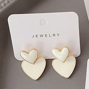 White-Gold Enamel Double Heart Front Back Minimalist Dangle Earrings