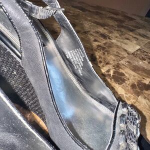 Step out in style with these White House Black Market embellished wedge heels! These chic black heels feature dazzling diamond embellishments on the toe box strap and a comfortable wedge heel. Perfect for adding a touch of elegance to any outfit. These heels are in fair condition. Don't miss out—grab them now!