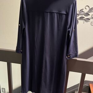 Chic navy shirt dress with gold button accents. Perfect for versatile styling. 3/4 sleeves. Length 39”, pit to pit 22”. Brand new without tags. From a smoke free home