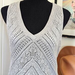 White House Black Market silver gray metallic knit v neck sweater vest, sz XS, tunic style, longer in the back, beautiful chevron pattern knit, side slits at the waist, versatile piece