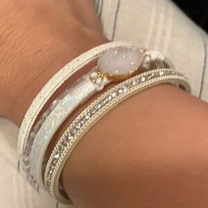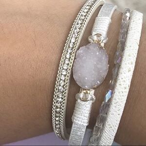 Beautiful White Leather, Multi Strand with CZ and Druzy Quartz Wrap Bracelet