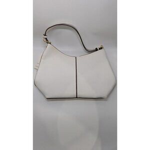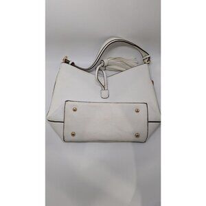 White/Mint Faux-Leather Tassel Purse. Well-used exterior, with some markings and discoloration; almost-new interior; overall good condition. It has tassels on the front with a snap-button top closure.