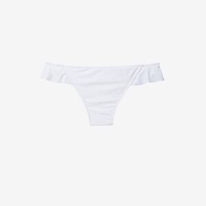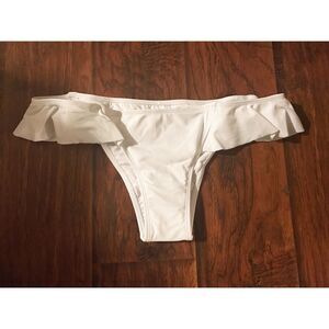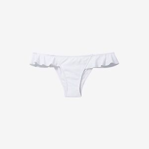 These versatile white low rise bikini bottoms feature a ruffle at the top of each leg with a cheeky cut. Pair them with a coordinating top or mix and match them with a print for a unique-to-you suit.