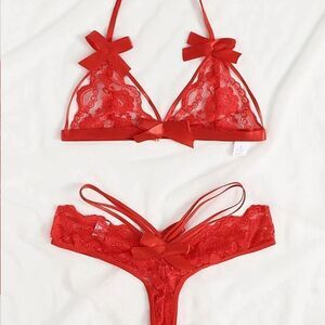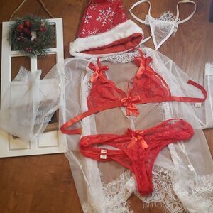 New Holiday Set. White Lace Sheer Robe with Red Lace and Bow Panty and Bralet set. Size Medium.