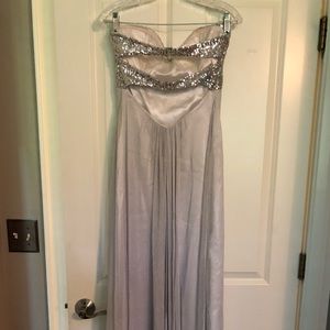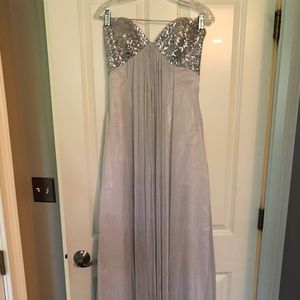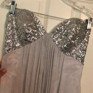 White floor length gown with silver/sparkly chiffon overlay and sequin top detail. Originally a size 6 but altered to be more like a 4. Only worn once, in great condition and stored flat since wearing.