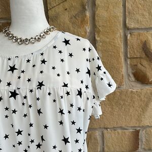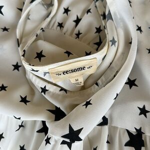 This flirty little dress ships to you in perfect, worn once condition. No visible signs of wear, snags, or stains. Bright white with black stars, fully lined, loose generous fit, flutter sleeves, women’s size medium. Dress hit slightly above knee. Boutique brand ee:some is true to size.