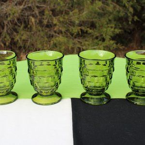 This is a set of four footed tumblers, made by "Colony" in the "Whitehall Green Avocado" pattern. Made through the 1960s and in perfect condition. No chips, cracks or scratches. Measuring 4 3/8in. in height and 3 3/8in. wide.