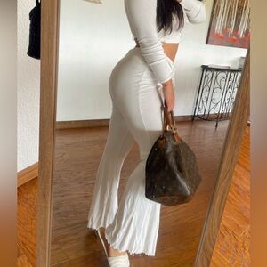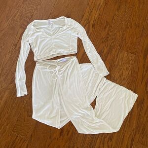 white ruched front flare bottom lounge pants and white long sleeve crop top
