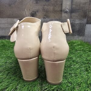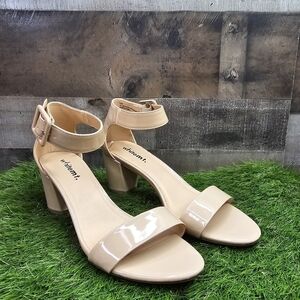 Step out in style with these chic patent leather block heel sandals. Perfect for any occasion, these cream-colored shoes offer both elegance and comfort.