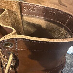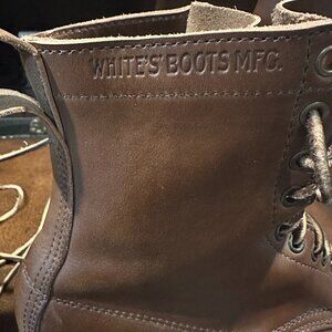 White's x Division Road boots in British Tan Chromexel leather on White's 55 Last. In very good condition, worn less than 10 times. Vibram mini lug sole in great shape. Have been wiped with a damp towel for cleaning. I do not have the original box.
