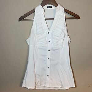 Gorgeous, bright white, sleeveless, classic, work blouse. Material is “elite stretch.” Silver button details. Awesome shirt! Pit to pit is 17”. Length 24”.