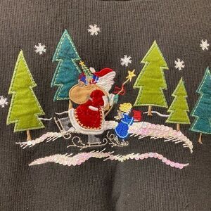 Like new White Stage vintage black embroidered Santa ugly Christmas sweater tunic top. EUC, great shape, size XL, cotton blend, super soft, relaxed fit, crew neck, Santa with felt, embroidery and sequins, see pictures for details.