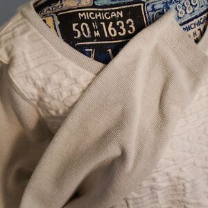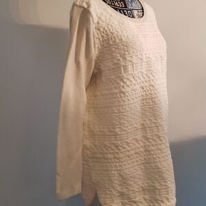 White sweater style top tunic top with grey sleeves & coller. Beautiful top. Sleeves & lining around the collar are a light grey. Super comfy. Zips up in the back. Would look great with leggings.