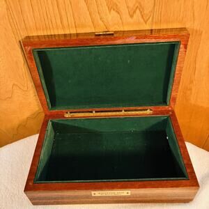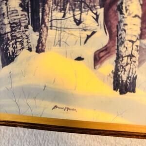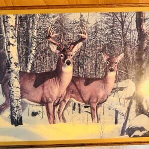 Beautiful “Whitetail Duo” by Bruce Miller framed art keepsake box featuring two majestic deer in a serene winter forest. The top showcases Miller’s detailed wildlife artwork mounted on a solid wood box with a nameplate and soft green felt interior — perfect for storage or decor.