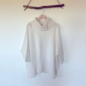 White knit oversized turtleneck sweater with 3/4 sleeves